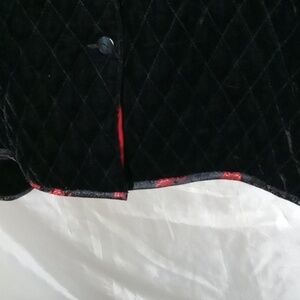 There is no size or tag on this item. In my opinion it's a medium/large. It is soft like velvet, but not velvet. Definitely has a vintage look to it!
