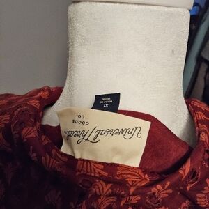 Elegant red blouse with intricate patterns. Features a ruffled collar and button-down front. Perfect for a stylish look.