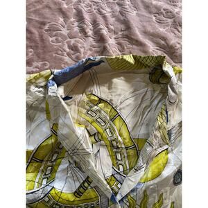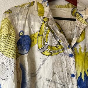 This vintage long sleeve button-up is made from luxurious 100% silk and features a mystical sun and moon celestial print that’s both ethereal and bold. The soft, fluid fabric drapes beautifully, and the classic button-front style gives it versatile wearability. With long sleeves and a relaxed fit, this shirt is a dreamy addition to any vintage lover’s wardrobe. Perfect for those who adore astrology, cosmic themes, or 90s celestial trends.