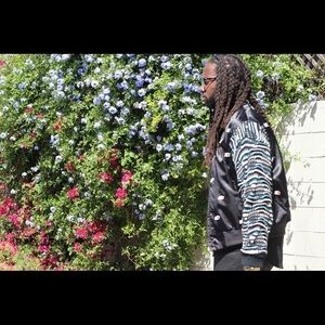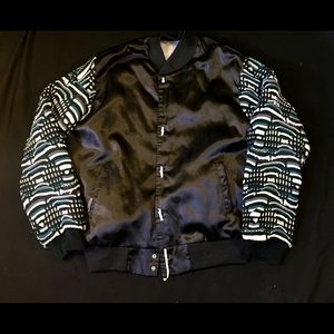 Jacket is custom made with authentic coogi australi mercerized cotton sleeves on a satin varsity jacket with authentic starter logo patches sewn across front and back. Jacket has no lining so it’s lightweight and not super bulky perfect for layering. Ribbed collar and cuffs and two front slant pockets with snap button front. Authentic vintage from the 80s 90s y2k retro streetwear era