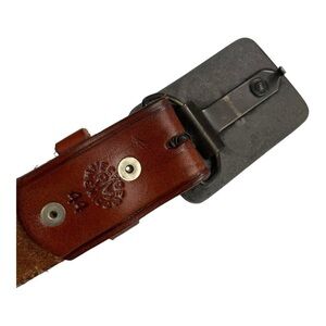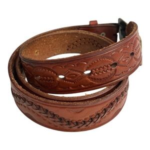 You are looking at a genuine braided leather belt. The leather belt measures 49”long and belt is size 44". The buckle measures 3”wide X 2" H and the leather belt is 1.5” wide with lovely hand tooled leather. The buckle is made is gold tone hardware and belt is made in Mexico sized 44”.