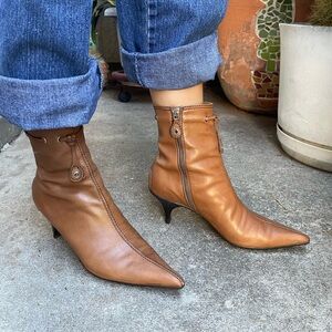 Classy and elegant vintage tan Prada The Original Car Shoe booties with exclusive silver hardware. Beautiful stitching and details. Soft and smooth leather. Lightweight and super comfortable. Great used condition. Made in Italy. European size is 38.5, feels like size 8/8.5. Heel height is 2.7”. Circumference at the top is 11”. Original box included