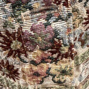 This is a vintage tapestry-style embroidered vest with a holiday and winter motif featuring snowflakes, snowmen, and other patterns. It is a size small per its label, but it is a comfortable cut. A medium could definitely wear this. It was designed to feature buttons as there are three button holes. However, there are no buttons. I don't think they are necessary to the "look." Made in the U.S.A. 60% cotton, 40% polyester. Does not feature a name brand on any labeling. Please check my other listings for similar items as I will bundle to save you postage costs.
