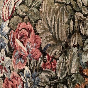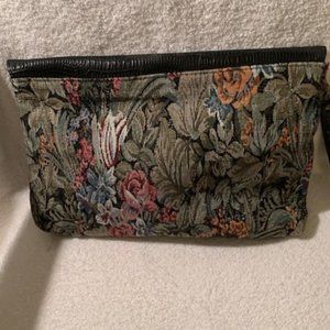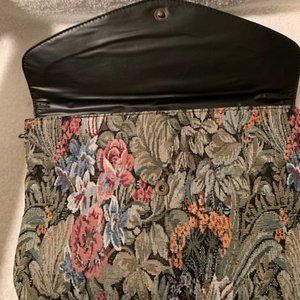 Vintage tapestry envelope/clutch purse. Has plastic lining. One zipper compartment inside. Closes with a snap. Has handle on side which is removable. Faux leather flap. In good condition. No flaws.