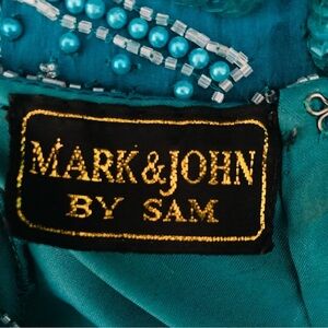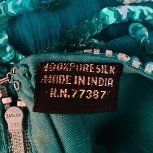 Vintage teal blue green beaded and sequined silk dress. Beaded fringe at tulip hemline and at sleeves. No size tag. Est size 6 based on measurements.