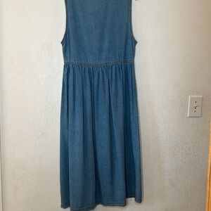 Classic jumper dress with a teddy bear twist! Teddy bears are embroidered on lightweight denim fabric. Sleeveless and buttons all the way down the front.