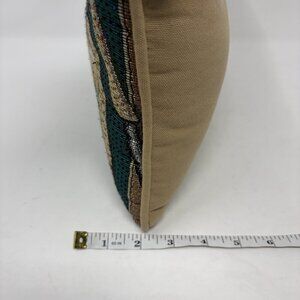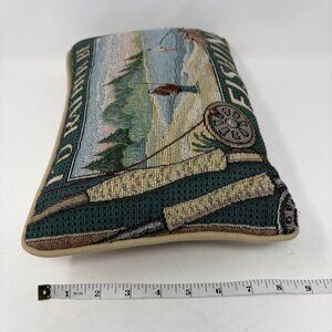 Vintage tapestry throw pillow. Has a lake image of a man fishing and the words I'd Rather Be Fishing on one side. Predominantly green. Other side is plain tan. Done in a needlepoint style on the front. Measurements shown in photos.
