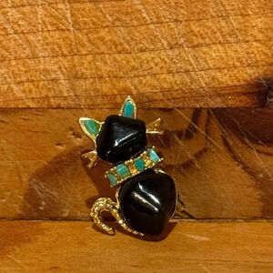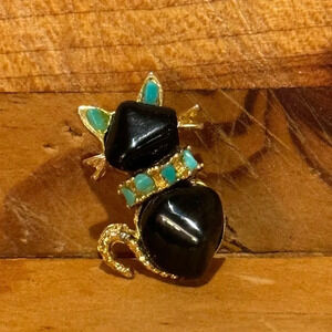 Vintage tiny cat kitty brooch pin Gold Tone Black Stone Green Accents