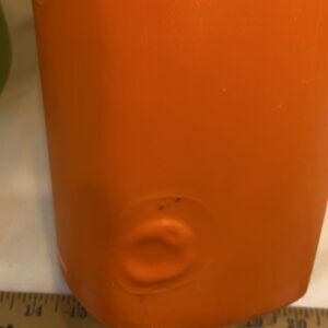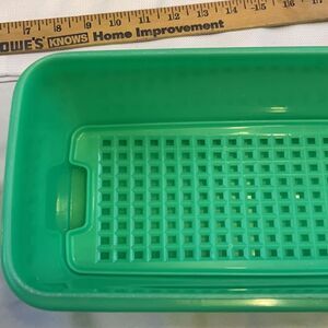5 large containers. 2 have melt marks. These are vintage and rare. 3 are Square on bottom and round on top. Long green has insert.
