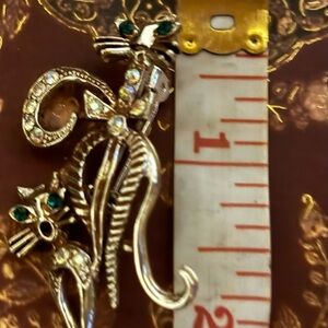 Vintage two cat pin 1960s gold tone with green rhinestone eyes and AB rhinestone