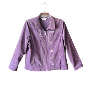 Vintage 2 piece embroidered corduroy pant set. Size 10P. The jacket has shoulder pads and is zip front with embroidery and has two,pockets. Long sleeve. Length is 24”. Pit to pit approx. 20” flat lay. The pants has elastic waist and two side pockets. Waist is 14” approx. and inseam is 24”. Rise is 12”. Great condition.