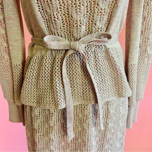 Beautiful vintage knit sweater and skirt set with knit belt. This items is in excellent condition, I did not spot any flaws. The tag says it is union made. I did not see a fabric tag but it feels like a natural and synthetic blend. Fits like a modern small.