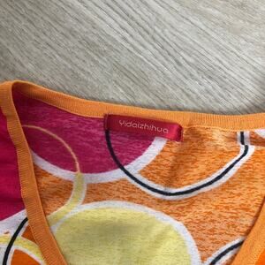 DETAIL: vintage bright vibrant orange, yellow, and magenta pink circle print vneck dolman short sleeve top. Abstract, retro, unique