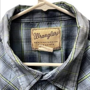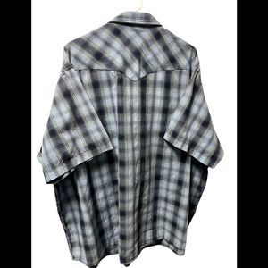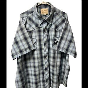 Vintage wrangler, short sleeve blue and green plaid button up, pearl snaps XXL