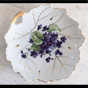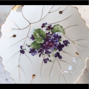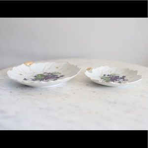 Two vintage white plates with purple floral design, gold trim and a leaf shape. These plates are adorable! The bigger one measures 7in and the smaller one is 5.5in. Would be so fun as jewelry holders or set out for display.