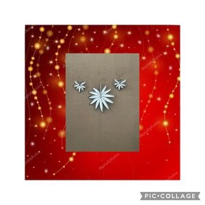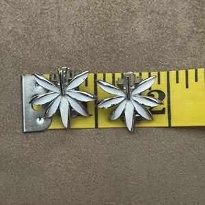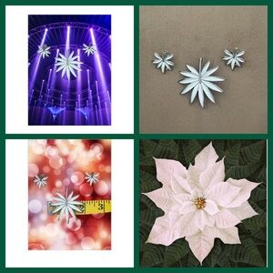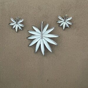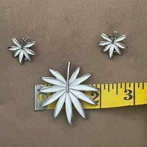 White poinsettia style brooch with matching clip back earrings in excellent vintage condition. No signs of wear. Measurements shown in pictures. L