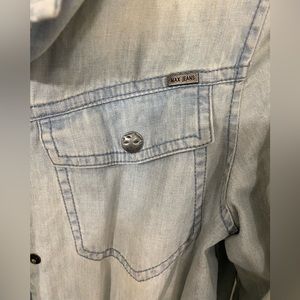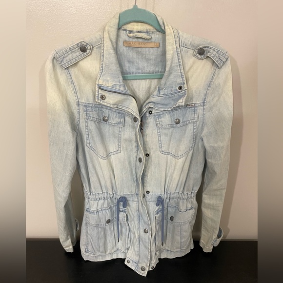 Max Jean light denim jacket. Light weight. Cinches at waist. Fits like a large. Worn 2 times