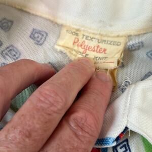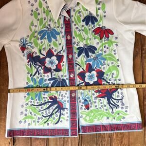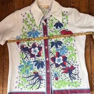 Vintage women’s 1970s polyester, Polynesian Floral Graphic Short Sleeve Shirt