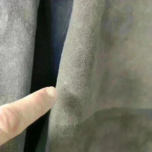 This vintage 100% leather short jacket is kind of heavy but is so comfy. The jacket has no zipper or buttons. The front is a soft hang with pockets on each side. The inside is lined with purple-ish colored lining, says Jordash.