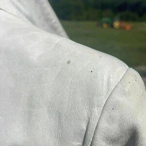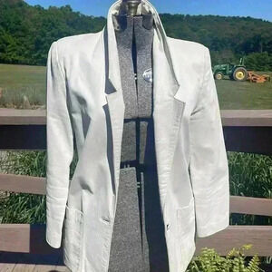 New York vintage women’s blazer. The blazer is 50% nylon and 50% acetate. The blazer does have shoulder pads . If you love vintage, this is the blazer for you. Would be amazing with a summer skirt and a crop top for a night out on the town. This jacket looks like a leather jacket.