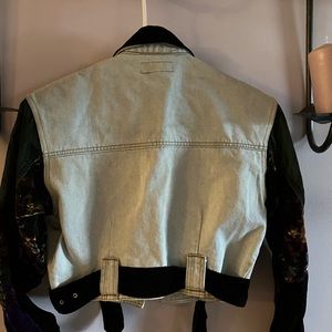 vintage 25+ year women’s denim crop jacket, size medium EU C, complete with shoulder pads and belt