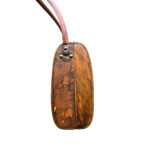 This charming vintage wood and bamboo basket handbag features an embossed floral design with a retro latch closure, perfect for a unique style statement.