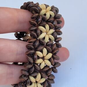 Charming vintage boho bracelet made from natural wood beads in dark brown and light tan hues. The beaded design forms a repeating floral pattern, resembling daisies, and is strung on stretchy cord for a comfortable fit. Likely handmade in the 1970s or early 1980s, this piece brings earthy folk vibes to any outfit. A wonderful addition to a vintage hippie, beachy, or nature-inspired collection. In good vintage condition with light patina on the wood.