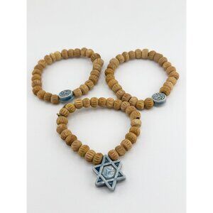 Vintage wood bead porcelain Jewish star multi strand bracelet set. Three strands of wooden and porcelain tree of life beads with hanging porcelain Jewish star. MN54FGH.