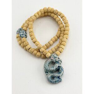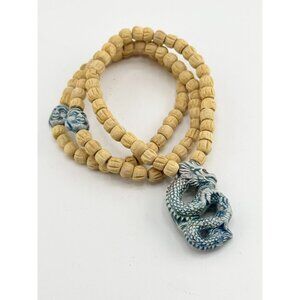 Vintage wood bead porcelain dragon serpent multi strand bracelet set. Three strands of wooden and porcelain beads with hanging porcelain serpent dragon. Buddha beads. MN54GH.