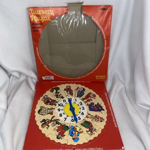 wood puzzle old nursery rhymes jigsaw 26 piece clock wooden puzzle. Made in England by condor. A slight rip on Humpty Dumpty puzzle piece. Box has some damage. Good used preowned condition.