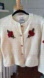 Charming handmade 100% wool cardigan with red floral embroidery on front and sleeves. Features wood buttons in front and lovely waist defining detailed stitches in front and back. A missed stitch or gap at gathered sleeves on one arm which I never noticed when wearing but saw when photographing for this post. See last pic.