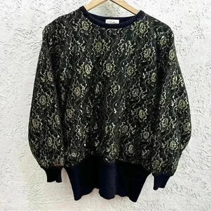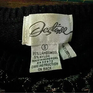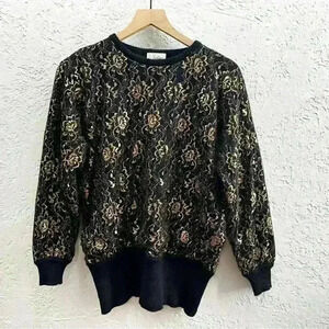 Vintage 80s wool black sweater with gold lace overlay size small. 95% lambswool. Ribbed black wristband and waistband. Please use approx measurements: