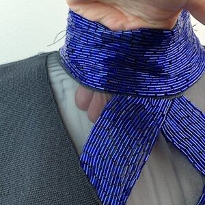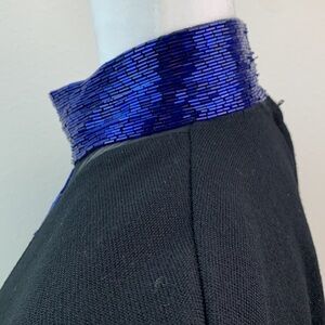 Mock neck is fully beaded in cobalt blue. Plunging sheer illusion V neck with beading. Medium weight tight knit material has stretch for comfort.