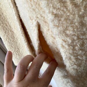 Women's vintage wool boucle coat. Brand is The American Way with Wool. No size tags, but appears to be an XS or XXS. Cream with yellow undertones. See measurements below. Nubby cream wool exterior. Made in the USA. Dry clean.