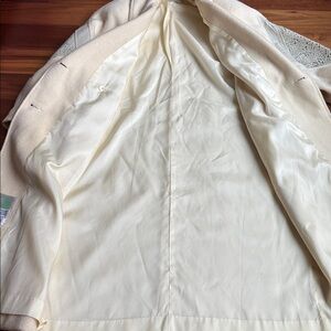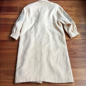 Beautiful cream double breasted wool coat by Fashions by Jill. Vintage 80s. Made is USA. Great condition. Fits like a L in my opinion. Faux snake skin leather accents on the arms.