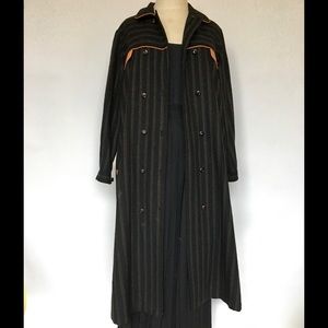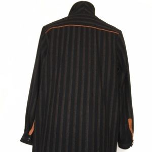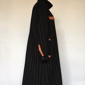 Rare 1970's vintage Korean coat, with markings for menswear tailor. Burnt orange, grey and black stripe with camel leather piping and pocket details. Sleeves are tapered with leather detail. Length hits at mid calf. Fits an XS or Small.