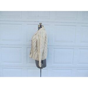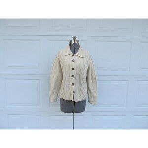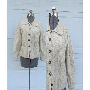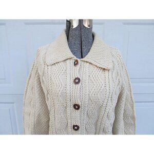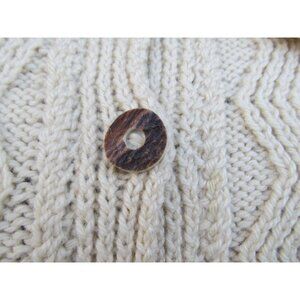 This is a vintage unisex sweater, a cream cable knit wool cardigan or fishermans' sweater. Faux wooden buttons. Sweater is warm and feels like wool. Very chunky knit. No tag. Overall good condition.