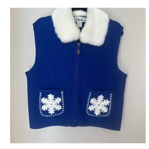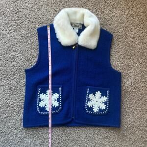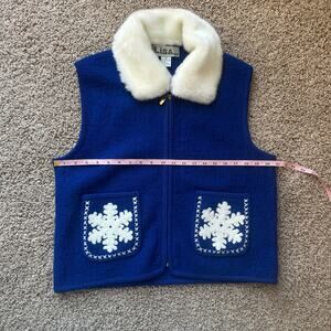 Vintage wool winter snowflake vest with faux fur collar, size Large, whimsical