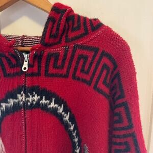 Vintage red Tejidos Ruminahui wool sweater coat w hood dream catcher full zip in size XL! In EUC w some minimal pilling. Southwestern native boho vibes. Indigenous design and heavy and warm made in equator