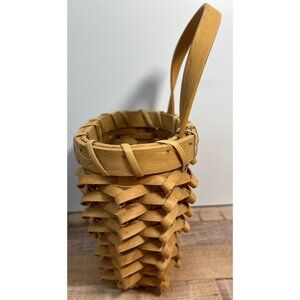Vintage woven curled light wood basket w turned handle, wall hanging, Door