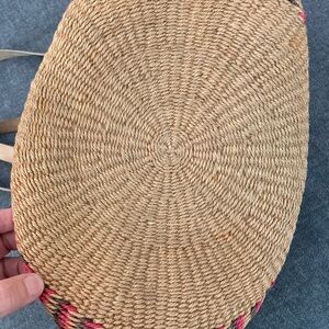 Leather-handled vintage sisal or jute woven market handbag purse. Fully cotton lined. Some discoloration (see pics) but overall great condition