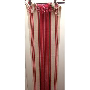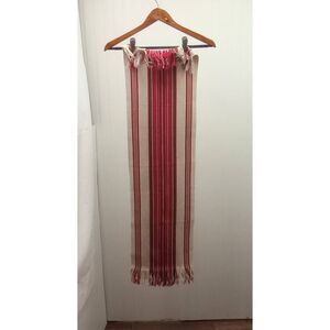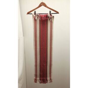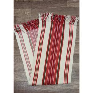 Pre-owned vintage table runner. They have been hand woven by looks of item. Colors are red cream with fine green stripes throughout. Fringe on both sides approximately 43 in Long x 12 in. Wide