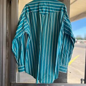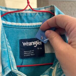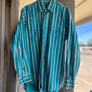 Vintage Wrangler blue and white striped brushpopper size 16-34. It is perfectly faded, but there are no major stains, holes, or tears. It fits about a size medium. Please check measurements before purchasing!