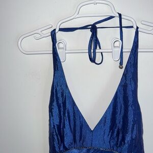 This stunning blue halter dress features exquisite floral embroidery, perfect for any special occasion. The deep blue color adds a touch of elegance and sophistication.
