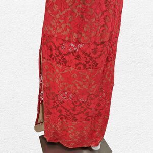 Vintage 2000s (y2k) ABS Allen Schwartz maxi dress. Sleeveless halter. Wrap front. Red and pink floral lace. Elastic waist. Slit up one side. Garment is in great preowned condition with some fraying to lace.
