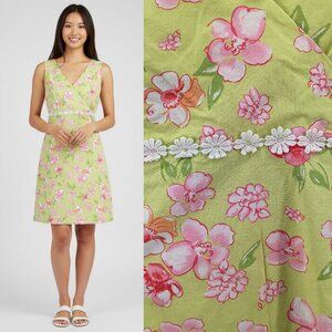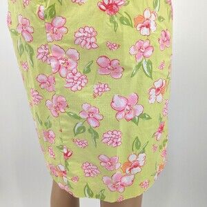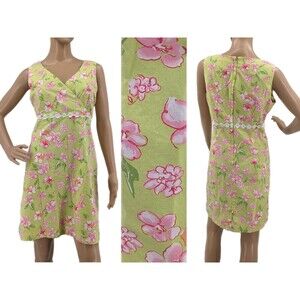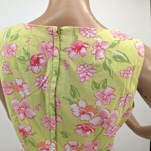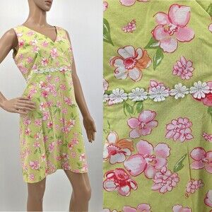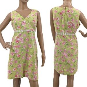 Vintage 2000s (y2k) Bay Studio midi dress. Green floral sundress. Wrap front with snap for chest closure. Zip up back. Unlined. Hawaiian/hibiscus print. Floral lace crochet detail at bust. Dress is in good vintage condition with gentle wear.