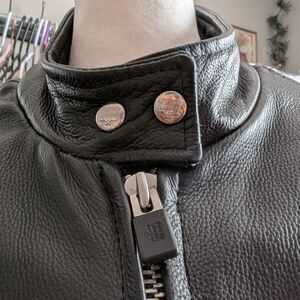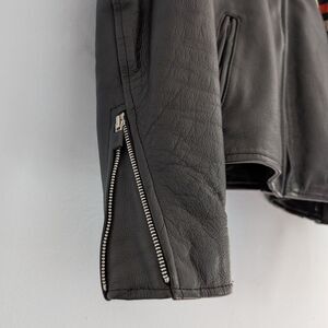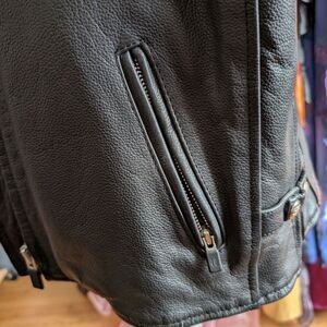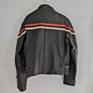 Super trendy vintage 2000s (y2k) Interstate leather moto/bomber jacket. Heavy duty textured leather. Genuine motorcycle jacket. Includes quilted inner liner. Heavy duty zippers and double snap at collar. Expandable shoulders for perfect fit. Side gussets with zipper and snaps. Zippers at wrists. Orange/red and cream racer stripes across chest and back. Zip front.