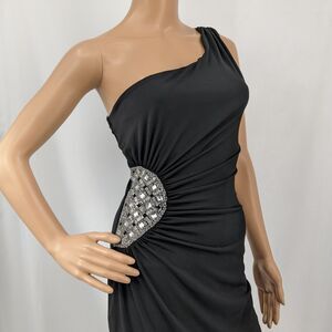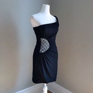 Vintage y2k City Triangles mini dress. One shoulder. Bodycon. Ruching details. Black. Rhinestone/beaded detail on side. Unlined. Dress is in good vintage condition with gentle wear and some loose threads at neckline. This flaw is inside garment and not visible from outside. Please see photo.