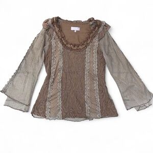 Vintage 2000s Pretty Angel Long Sleeve Whimsical Fairy Renaissance Ruffled Lace Blouse. Mesh Bell Sleeves. Scoop neckline. So angelic and cute