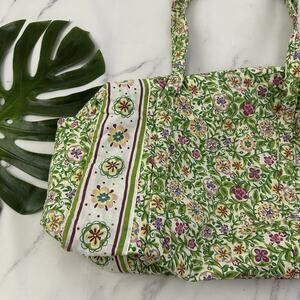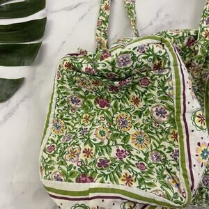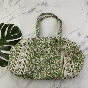 Vintage y2k green and pink floral quilted duffle travel bag. It has some wear and small marks, please see pictures. It measures about 18 inches long, about 10 inches tall and about 10 inches deep.